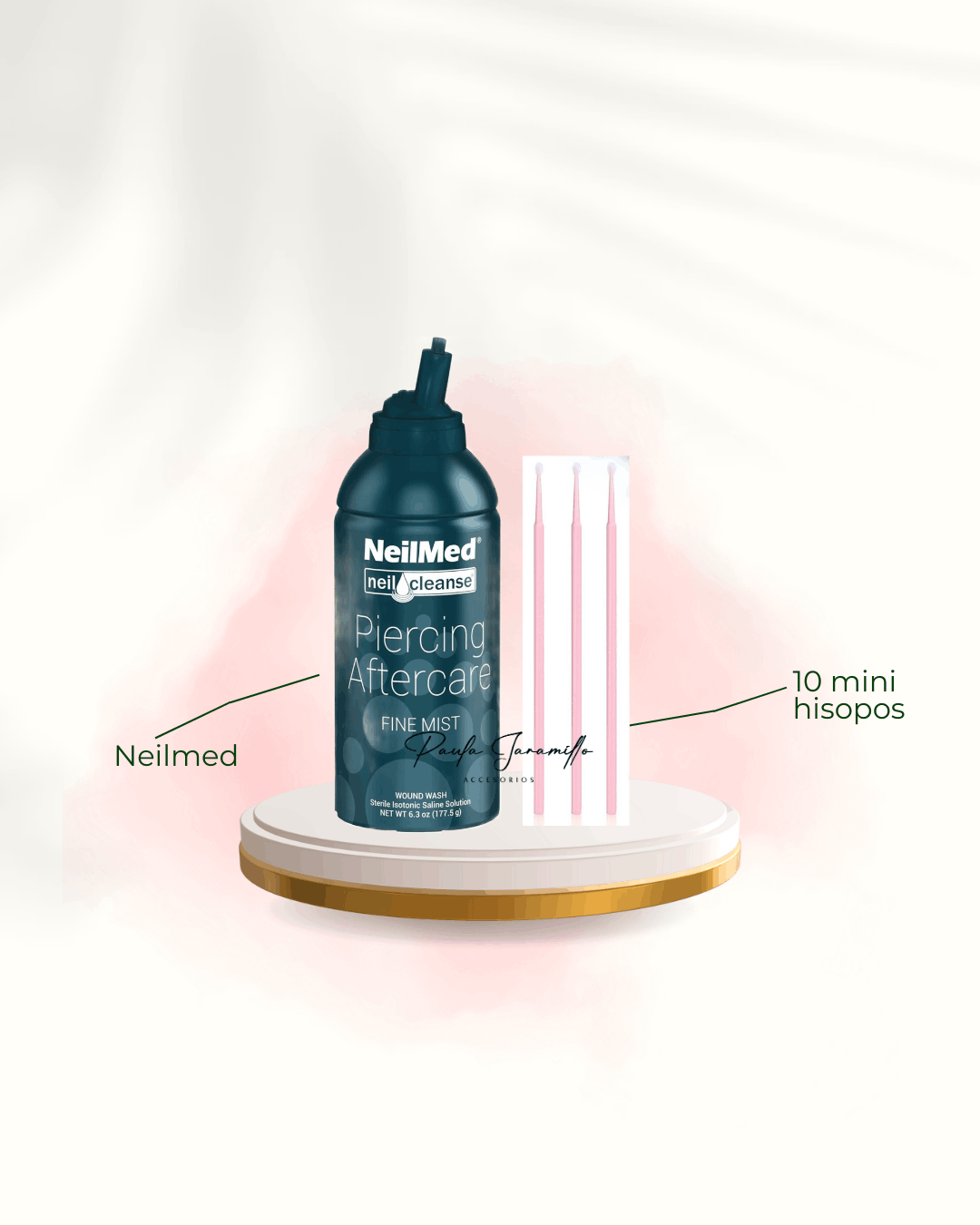 Es una solución salina estéril creada especialmente para el cuidado de tus perforaciones. Te ayudará a mantener una buena higiene lo cual aliviará el dolor, inflamación, infecciones y también ayudará a eliminar granulomas. Es el mejor producto para tus perforaciones. Te obsequiamos 10 mini hisopos.